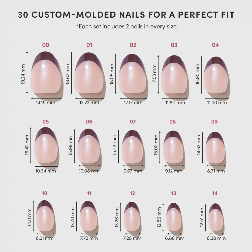 Polished with a bold edge. the Cherry Mood Press-On Nail brings juicy cherry energy in a refined. elevated way. Featuring deep red micro-French tips and a high-shine glazed finish. this short oval style is confident. sleek. and deliciously wearable.