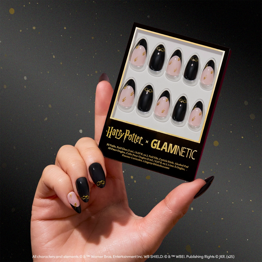 The Chosen One of nail sets. The Harry Potter™ design blends classic black French tips with solid black accents. layered with raised gold details inspired by his iconic glasses. Hidden lightning bolt motifs on the back of each nail nod to the mark that started it all. In a short almond shape with a glossy finish. it’s bold. instantly recognizable. and brimming with main-character energy you’ll want to wear through every chapter.