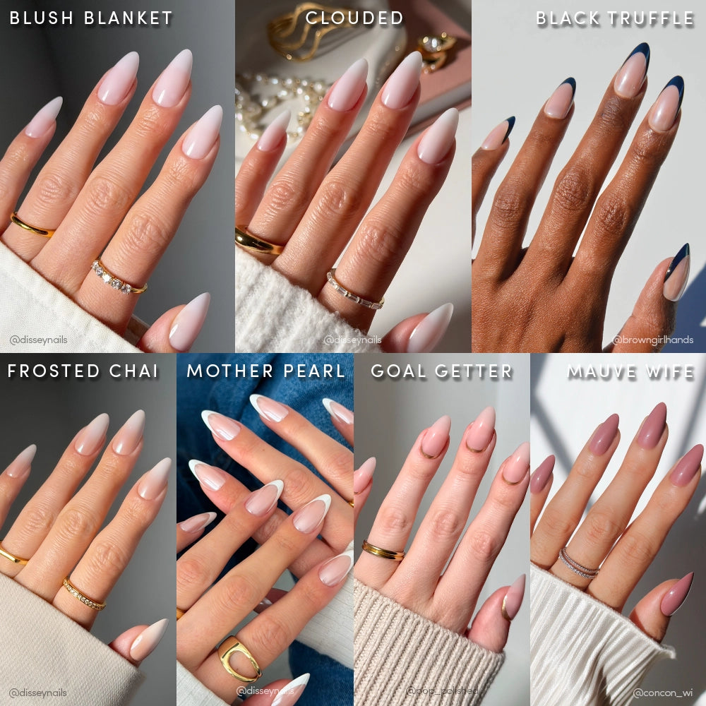 • Blush Blanket: Medium almond milky press-on nails with a soft pink. semi-transparent base and a high-gloss finish