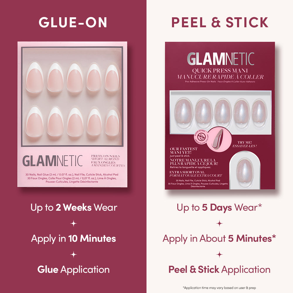 Quick Press Manis are no-glue nails. engineered with our advanced Smart Flex Technology™ to ensure a comfortable fit on flat or curved nail beds. Each fake nail set ultra-slim cuticles for a natural feel and tips crafted 50% thicker than the cuticle for added strength. Finished with our protective UV top coat. these stick-on nails are just as chip-resistant as our glue-on press-on nails.