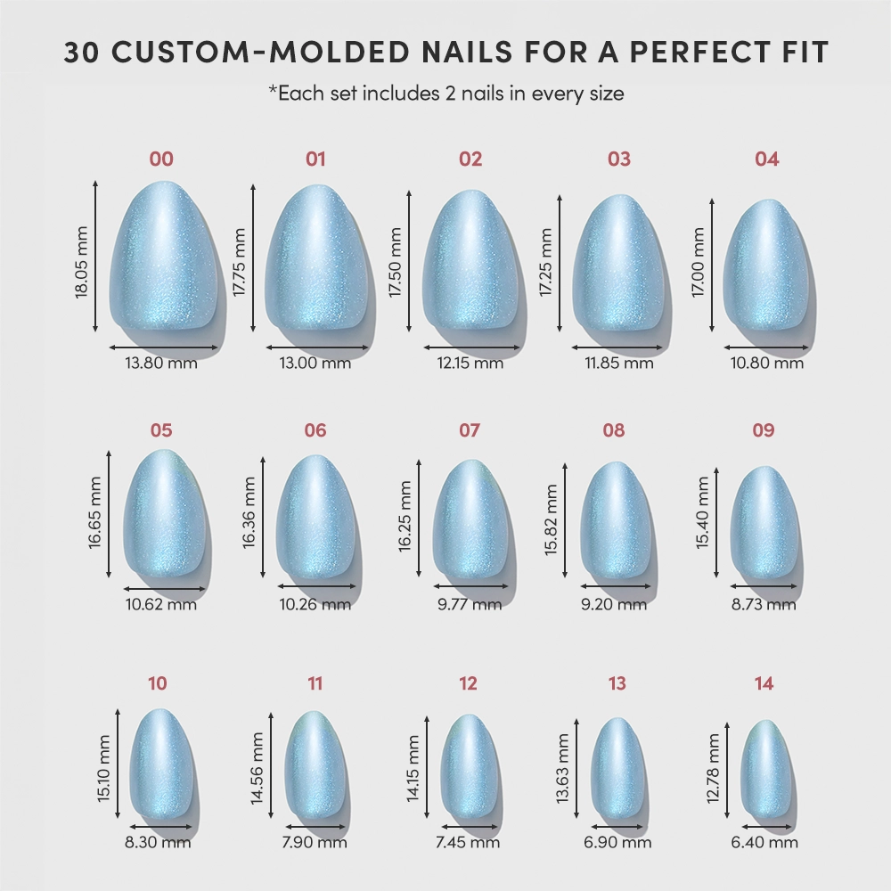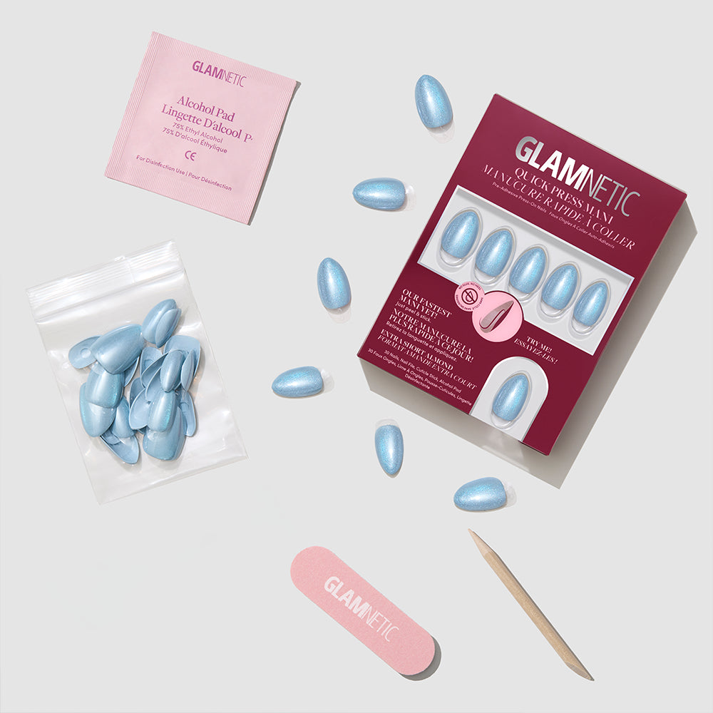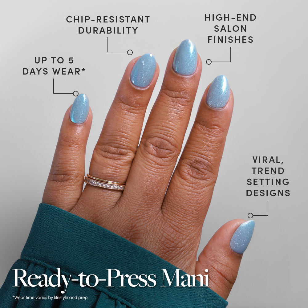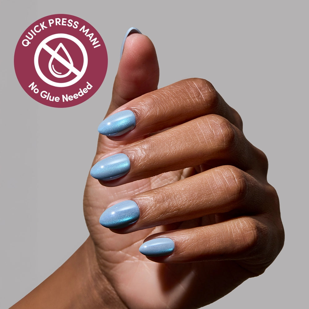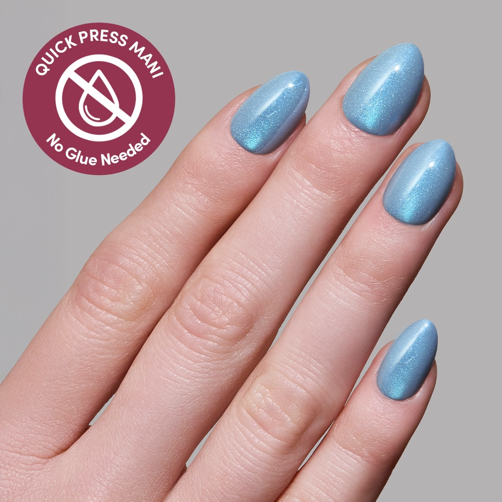 Now this is a sleek set. The Ocean Prism Quick Press Mani gives you nails a dreamy. blue-grey shade with a glistening glaze that reflects the light beautifully. Designed in our extra short almond shape. they’re effortless chic for up to 5 days wear.* All you have to do is just peel and press to apply this salon-quality set. No glue needed.