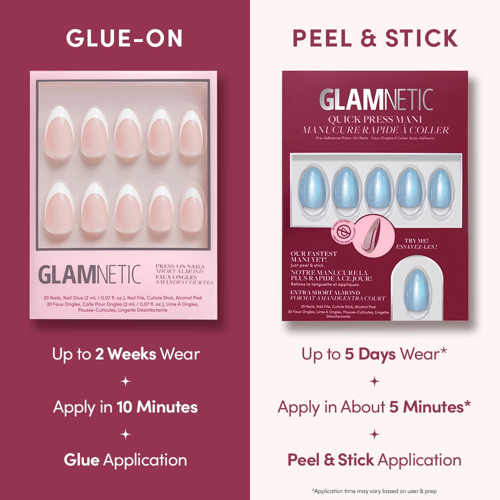 Quick Press Manis are no-glue nails. engineered with our advanced Smart Flex Technology™ to ensure a comfortable fit on flat or curved nail beds. Each fake nail set ultra-slim cuticles for a natural feel and tips crafted 50% thicker than the cuticle for added strength. Finished with our protective UV top coat. these stick-on nails are just as chip-resistant as our glue-on press-on nails.