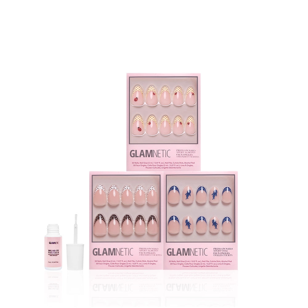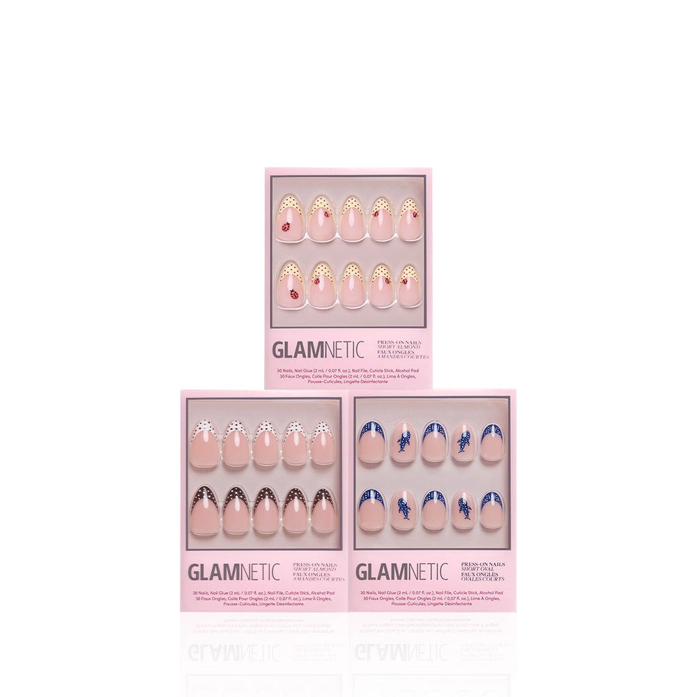 Play with polka-dots with this bundle of 3 Euro Summer nails. From ladybug-dotted yellow tips and Positano-inspired brown-and-white patterns to Nordic whale accents. each set brings coastal charm with a wink.