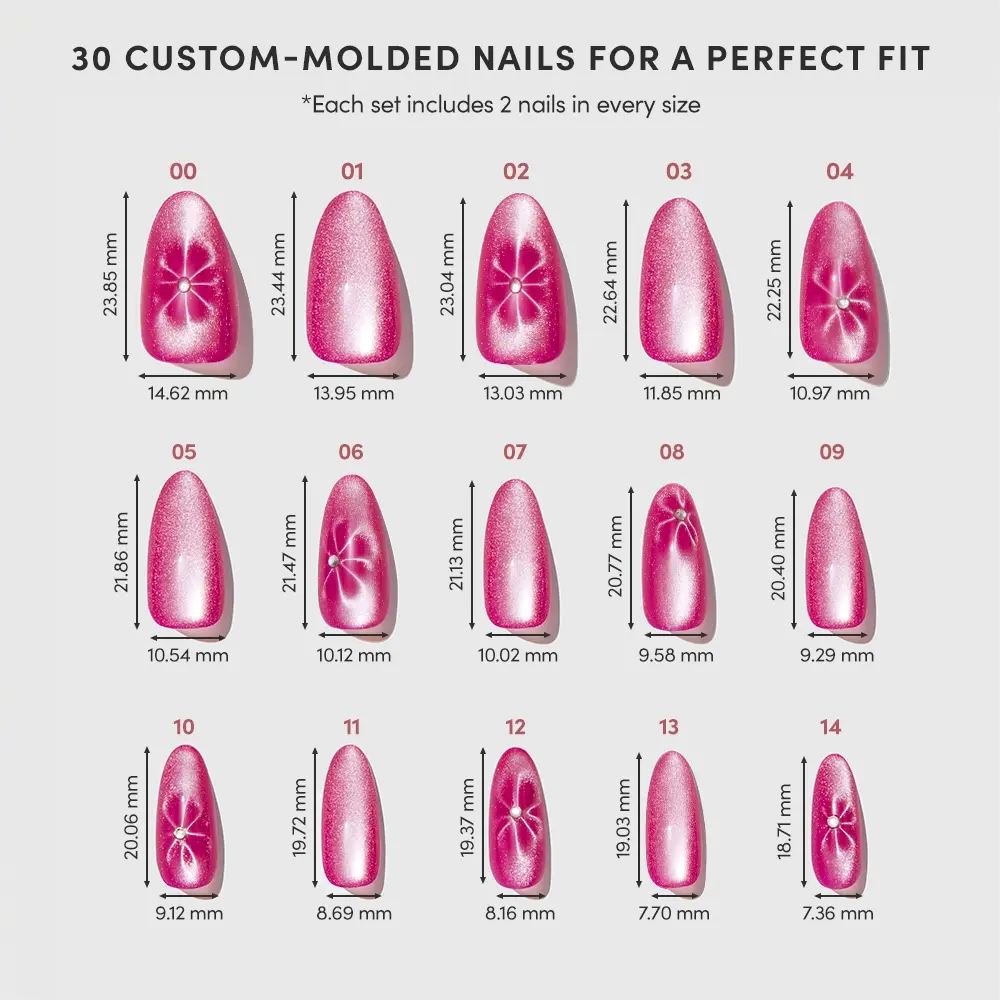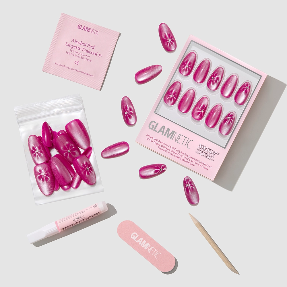 Turn that garden-party glow all the way up with Rosy Siren. Featuring a vibrant magenta-rose base hue. this medium oval design is subtly layered with floral detailing and 3D gem accents for a look that adds dimension. while still being wearable for any daytime to nighttime plans.