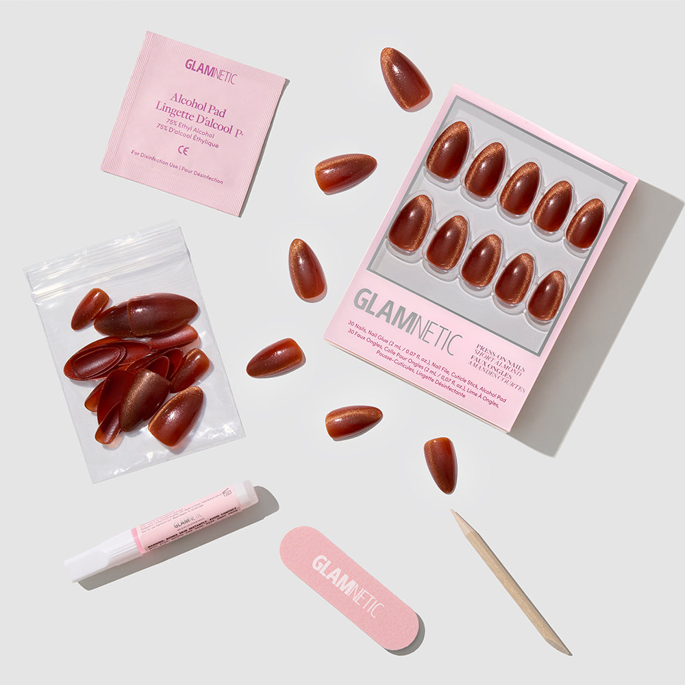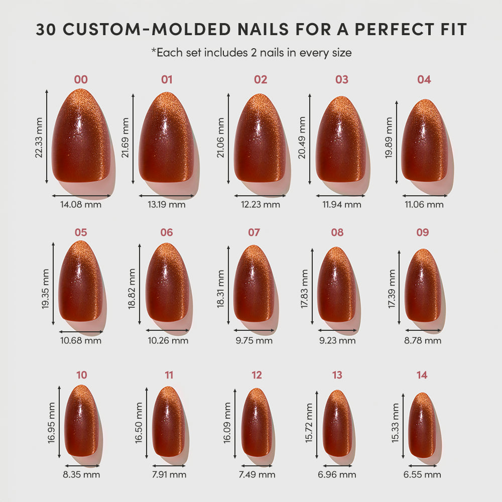 Bring Italian sunsets to your fingertips. Sicilian Sun is a short almond press-on nail set with a warm dark brown base and our signature multi-dimensional velvet finish that mimics the glow of golden hour. It’s rich. effortless. and an impossibly wearable mani for your dreamiest summer. Apply in 10 minutes. wear for up to two weeks.