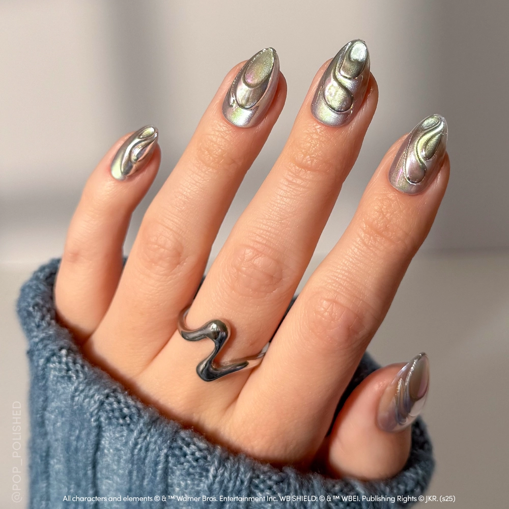 As rare and mesmerizing as the creature it’s named for. the Unicorn Blood Nail Set shimmers with a liquid silver chrome base and swirling 3D accents that ripple like moonlight on the Forbidden Forest floor. The short almond shape and semi-transparent finish give it an ethereal. otherworldly quality that’s equal parts magical and modern.